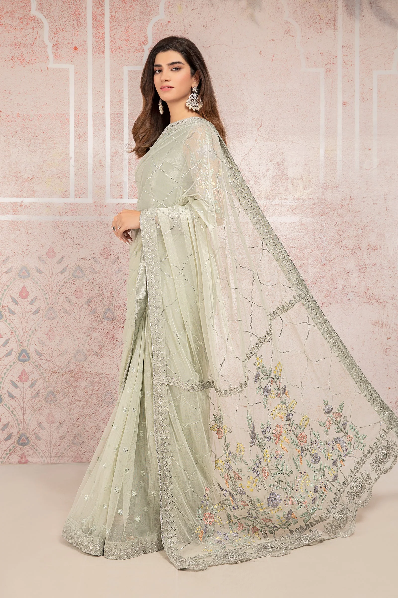 Embroidered sari net with beautifully embellished embroidered pallu and blouse with embellished neckline and embroidered sleeves
